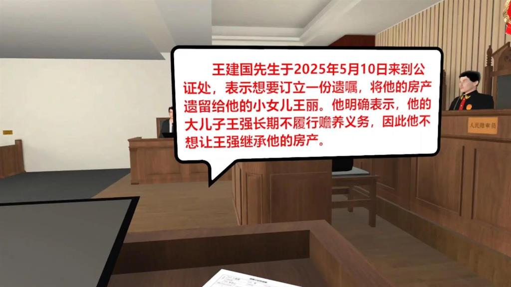 模擬成為一位公證員,體驗(yàn)遺囑公證、出庭作證等公證業(yè)務(wù)流程,讓用戶在虛擬環(huán)境中深入了解公證業(yè)務(wù)的各個(gè)過程,提高業(yè)務(wù)理解和操作能力。體驗(yàn)完成后將進(jìn)行答題測(cè)試,以檢驗(yàn)用戶對(duì)公證流程的理解程度及法律知識(shí)掌握情況。