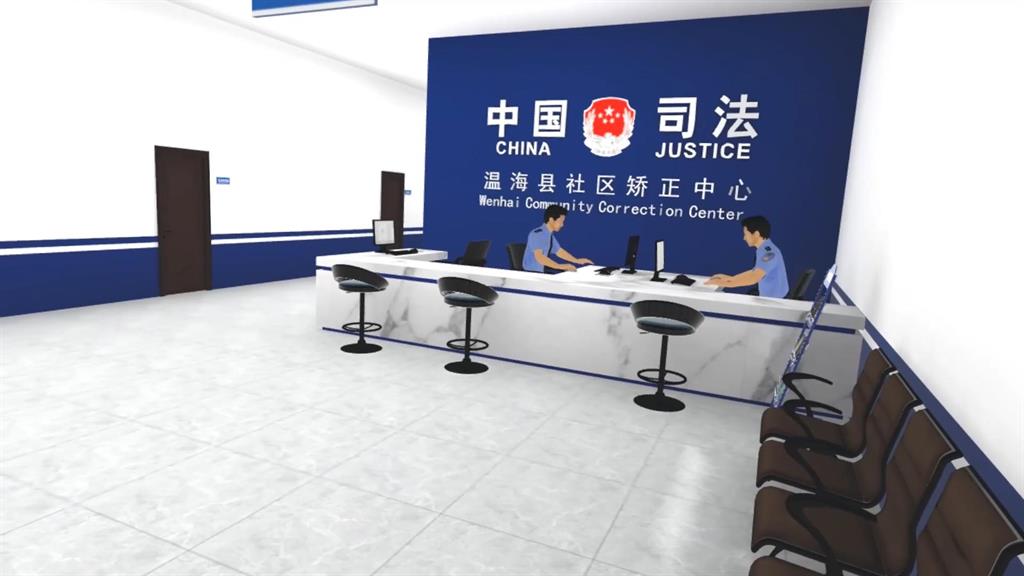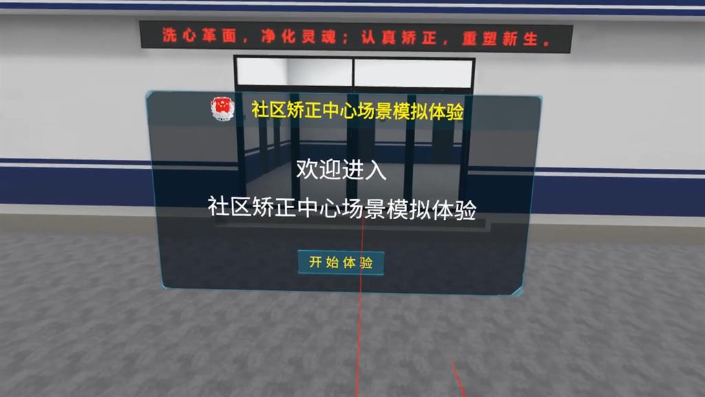 進(jìn)入VR場(chǎng)景,體驗(yàn)者站在社區(qū)矯正中心大門前,點(diǎn)擊手柄即可進(jìn)入內(nèi)部。大廳內(nèi),系統(tǒng)語音隨即介紹中心的主要職責(zé)與區(qū)域劃分。隨后,體驗(yàn)者可自由漫游至各功能室,系統(tǒng)會(huì)詳細(xì)介紹每室的功能及在社區(qū)矯正中的作用。此外,大廳還設(shè)有互動(dòng)答題環(huán)節(jié),增強(qiáng)體驗(yàn)趣味性與知識(shí)性。
