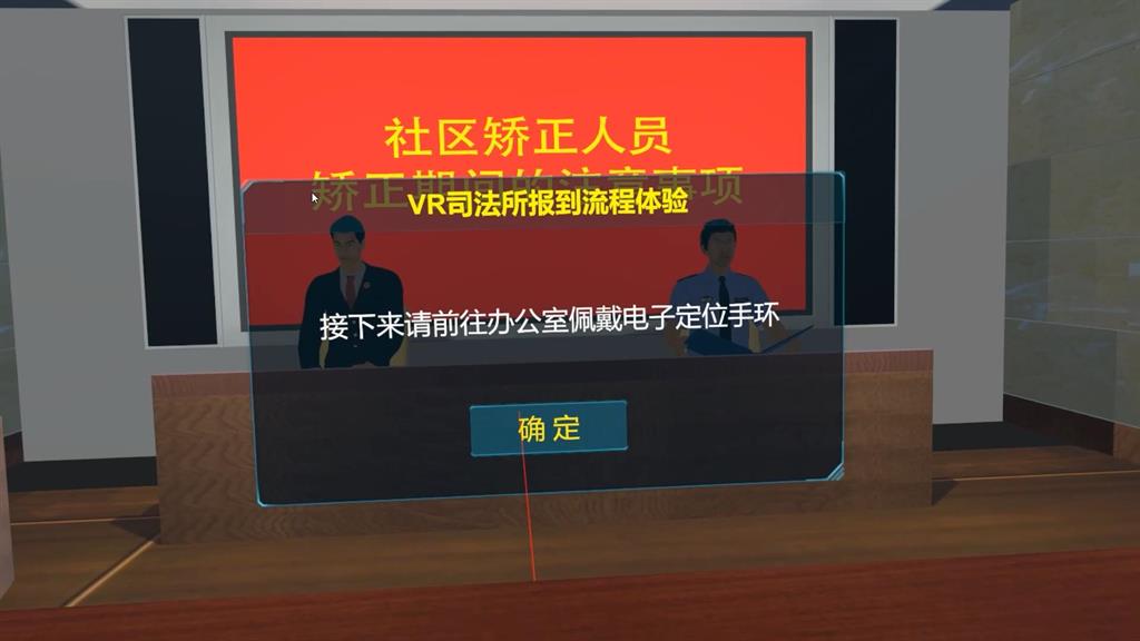 模擬整個司法報到和辦理社區(qū)矯正等流程,體驗者以第一視角攜帶相關(guān)證明到司法所完成相應(yīng)的報到程序,包括進入司法所、填寫信息、做心理健康測試、宣讀矯正規(guī)定、佩戴電子手環(huán)等。