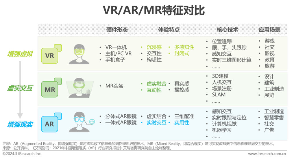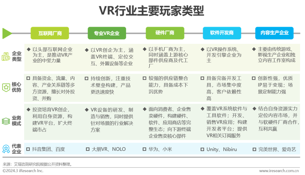 市場規(guī)模:2023年全球VR終端出貨量為765萬臺,其中Meta、Sony、PICO、DPVR和Valve位居前五。艾瑞預估2024年全球出貨將突破810萬臺。伴隨生態(tài)成熟與新品迭現(xiàn),特別是蘋果迭代產(chǎn)品對于市場的引爆可能性,艾瑞預估,2027年全球市場將有飛躍式增長