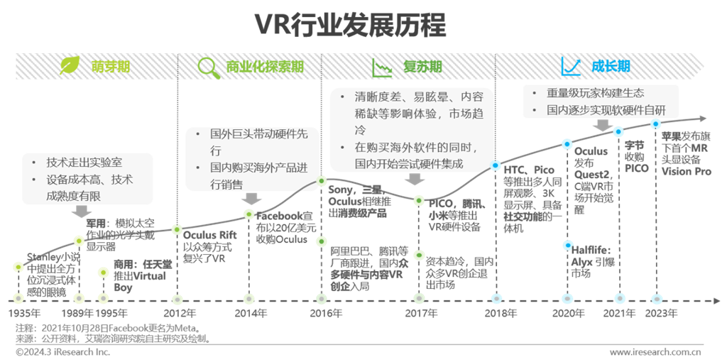 虛擬現(xiàn)實概念源于科幻小說,由任天堂等游戲廠商開啟商業(yè)化之路。早期設備成本高,技術成熟度有限,游戲廠商的嘗試都宣告失敗。2016年是虛擬現(xiàn)實的元年,硬件巨頭消費級產(chǎn)品的推出,疊加中國眾多VR創(chuàng)企大力進軍硬件端與內(nèi)容端,短期市場呈爆炸式增長。但行業(yè)整體處于民用初期,受內(nèi)容稀缺、設備易眩暈、屏幕清晰度差等影響,消費級市場整體發(fā)展放緩。伴隨行業(yè)技術日趨成熟與產(chǎn)業(yè)玩家的擴容,行業(yè)在2020-2022年邁入發(fā)展的關鍵階段,Quest銷量迎消費級拐點。2023年蘋果Vision Pro發(fā)布,其對全新交互方式的實踐為業(yè)內(nèi)玩家?guī)硇碌乃伎?。作為現(xiàn)階段頂配產(chǎn)品,Vision Pro的出現(xiàn)不僅極大拉動虛擬現(xiàn)實產(chǎn)業(yè)玩家信心,同時在市場激起的“浪花”,為行業(yè)帶來更多關注。艾瑞認為,在可預見的27~28年,蘋果二代甚至三代產(chǎn)品將貢獻下一個里程碑,為產(chǎn)業(yè)帶來新的爆發(fā)。