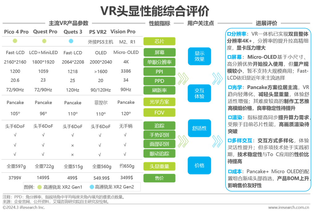 技術側:核心芯片、顯示屏幕、光學方案、交互技術等均有突破,但VR硬件整體性能美中不足,算力、清晰度、產(chǎn)品良率、交互靈活性等仍有提升空間