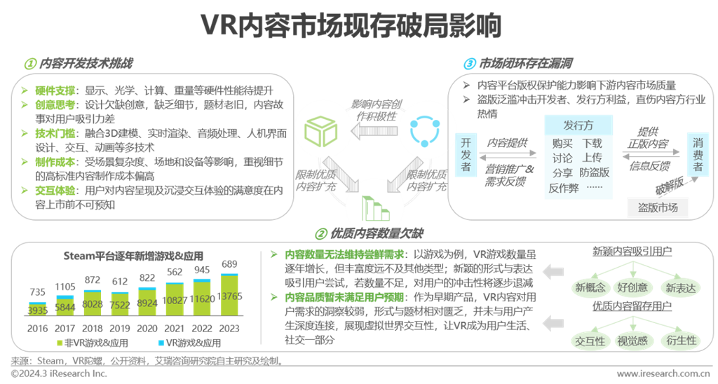 內(nèi)容側:開發(fā)技術限制優(yōu)質(zhì)內(nèi)容創(chuàng)作輸出,加之內(nèi)容市場環(huán)境成熟度欠缺,優(yōu)質(zhì)正版內(nèi)容難以獲得有效保護,反向沖擊創(chuàng)作者信心,內(nèi)容市場閉環(huán)待完善