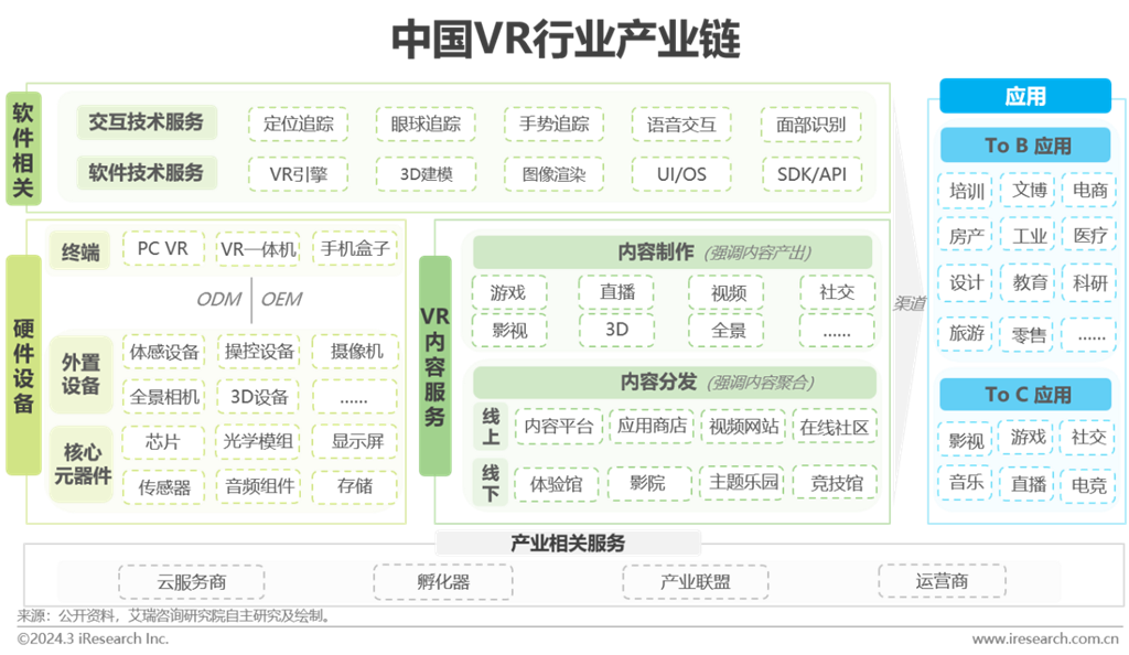 VR產(chǎn)業(yè)具備相對完整與龐大的產(chǎn)業(yè)鏈條,主要由硬件、軟件、內(nèi)容服務及應用領域四部分構成。光學、顯示與交互是VR硬件架構的核心構成。目前VR硬件條件基本支持VR游戲在設備上的流暢運行,但隨著眼球追蹤、手勢追蹤等交互技術的出現(xiàn)與發(fā)展,渲染技術對算力需求的提升,硬件與軟件的適配性將直接影響用戶體驗。硬件與軟件端的發(fā)力也帶動起內(nèi)容生態(tài)的繁榮,產(chǎn)業(yè)不再局限于游戲、社交,工業(yè)、醫(yī)療、零售等新業(yè)態(tài)也將加入,業(yè)態(tài)日趨豐富。
