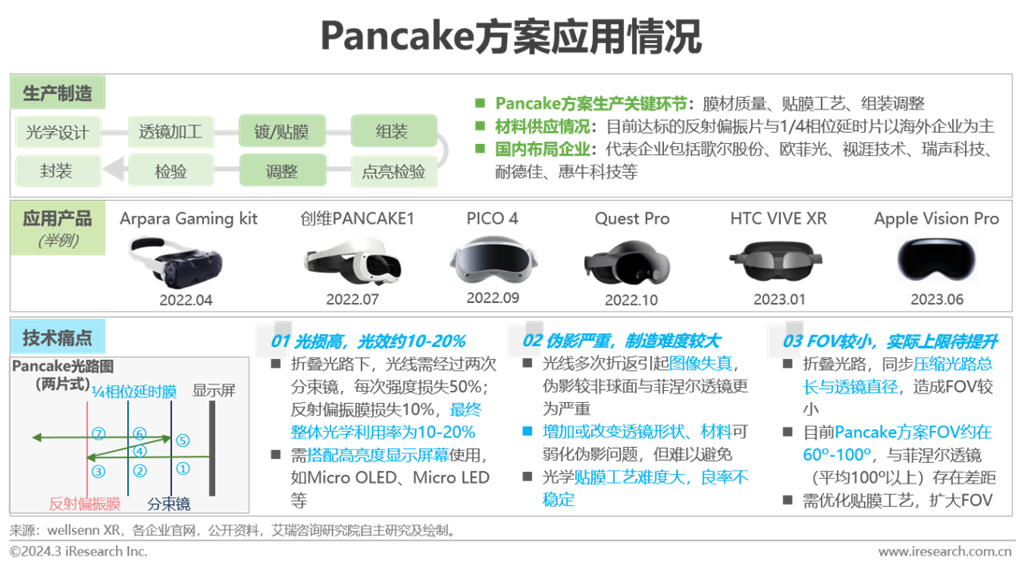 Pancake方案對頭顯的“瘦身”吸引了業(yè)內(nèi)多方的關注,近2年已有多款企業(yè)級、消費級的頭顯產(chǎn)品問世,包括蘋果推出的MR產(chǎn)品Vision Pro,再一次將Pancake帶進大眾視野。新方案的落地為VR市場注入新鮮活力,設備迭代加速,屏幕等配套設備相應升級,輕薄、成像質(zhì)量好的佩戴體驗進一步促進VR向大眾市場滲透。但Pancake方案并非十全十美,基于方案設計本身,在光效、FOV等方面有所犧牲。為提升方案的使用性能,制造工藝難度提高,成本隨之上升。故Pancake方案依舊是一個偏向過渡的產(chǎn)品形態(tài),未來一段時間業(yè)內(nèi)各方仍需在方案則選、產(chǎn)品體驗與制造成本等多因素間尋找平衡。