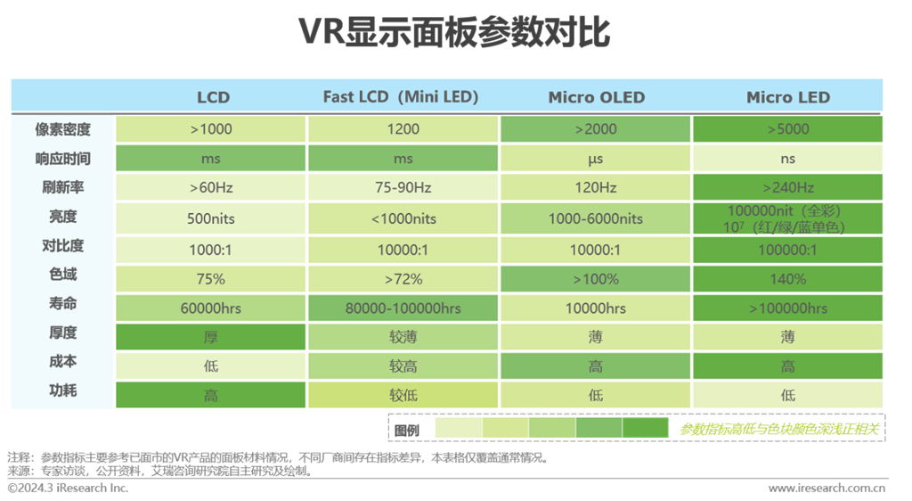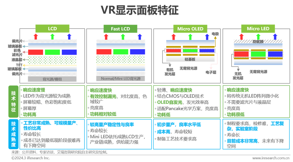 早期VR頭顯大部分采用LCD,礙于LCD響應速度慢,從2016年起,玻璃基OLED被嘗試應用于VR設備中。當前的VR設備主要采用Fast LCD屏幕,該類型顯示屏在響應速度、量產(chǎn)穩(wěn)定性、良率與成本等方面均有所改善。伴隨顯示方案的步步迭代,2022年起,VR產(chǎn)業(yè)頭部企業(yè)開始研發(fā)帶有Mini LED的Fast LCD顯示面板與Micro OLED面板,以求在對比度、刷新率、亮度、光效等方面獲得進一步提升。顯示屏亮度與對比度的提升,更好的適配了Pancake光學方案對高亮度的需求。值得一提的是,相較于Micro OLED的性能優(yōu)勢,Micro LED在屏幕輕薄度、光效、顯示性能等方案更為出色,目前以蘋果、三星為首的企業(yè)正積極布局,是未來VR顯示面板的理想選擇。