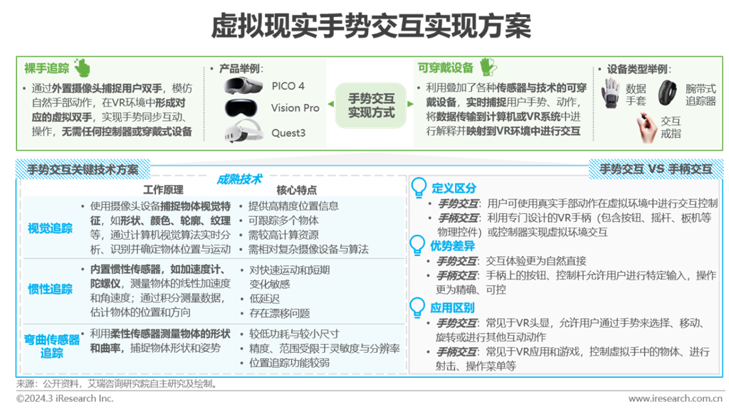 VR設備的手勢交互技術發(fā)展較為緩慢,裸手交互和可穿戴設備交互仍處于初期階段。針對不同應用場景,VR廠商的交互方案各有側重,如Meta Quest系列的裸手交互基于計算機視覺獲取數(shù)據(jù),用戶可快速體驗裸手效果;HTC VIVE則依靠腕式追蹤器,通過慣性傳感器提高手勢交互的準確性與可靠性。為了平衡裸手交互的沉浸感與手柄交互的高準確性,廠商們開始嘗試基于慣性傳感器或彎曲傳感器的數(shù)據(jù)手套方式。目前手勢交互更迭中需克服的難點主要來自(1)算法層面的數(shù)據(jù)質(zhì)量:保證數(shù)據(jù)質(zhì)量和一致性;(2)手勢關鍵點的識別精度:確保數(shù)據(jù)實時高效,優(yōu)化演繹模型;(3)交互設計的友好性:規(guī)避視覺死角,提升交互體驗。
