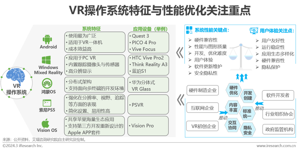 底層的VR操作系統(tǒng)處于虛擬現(xiàn)實應用程序與硬件之間,承擔管理硬件資源、提供驅(qū)動程序支持、處理輸入與輸出,協(xié)調(diào)傳感器數(shù)據(jù)等任務。早期的VR一體機基本沿襲了手機端的計算芯片與操作系統(tǒng),目前依舊以安卓系統(tǒng)為主,包括部分品牌機型的深度定制的UI。安卓系統(tǒng)為開源屬性,擁有龐大的開發(fā)者支持,具備跨平臺兼容性;利用安卓的現(xiàn)成基礎,廠商可以自行定制修改,快速推出VR新品。雖然安卓在業(yè)內(nèi)占據(jù)主導地位,但有部分制造商選擇開發(fā)自己的專有系統(tǒng),以滿足特定需求或為產(chǎn)品提供差異化屬性。目前,分體式的VR設備,包括PC VR、PSVR和華為VR Glass超短焦手機VR,操作系統(tǒng)以主機為主,同時涉及Windows MR、索尼PS和華為鴻蒙OS。蘋果Vison Pro搭載的Vision OS是一款VR/AR操作系統(tǒng),旨在提供沉浸式、交互性強的虛擬體驗。Vision OS可兼容iphone和ipad數(shù)十萬款應用,并內(nèi)嵌了iOS和空間計算框架、空間音頻引擎、注視點渲染引擎等。基于多年運營的生態(tài)優(yōu)勢,蘋果可擴速擴張Vision OS,搭建圍繞Vision OS的內(nèi)容與開發(fā)者生態(tài),對整個XR行業(yè)起拉動作用。