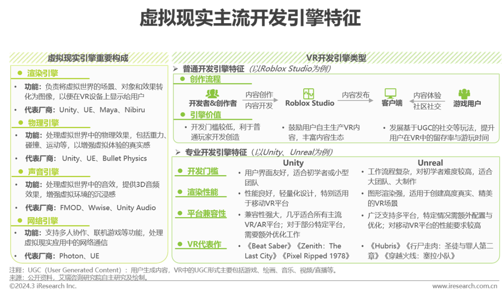 引擎平臺將軟件系統(tǒng)分解為若干功能模塊,以此來提高軟件開發(fā)效率、降低開發(fā)成本并增強軟件系統(tǒng)的可拓展性。VR產(chǎn)品強調(diào)交互體驗,開發(fā)前期需要實驗驗證,確保核心設計點符合VR場景。目前應用于VR的開發(fā)引擎以Unity和Unreal為主,在物理模型創(chuàng)建、圖像渲染、系統(tǒng)渲染等方面具備良好性能,因為該類型開發(fā)引擎具備一定使用難度,主要供程序員、開發(fā)者等專業(yè)人員使用。近兩年來VR行業(yè)玩家均在積極推進內(nèi)容生態(tài)的構建,加之元宇宙產(chǎn)業(yè)的迅速發(fā)展和AIGC刮起的新一輪科技熱潮,企業(yè)鼓勵普通用戶自主生產(chǎn)內(nèi)容,并提供開發(fā)門檻較低的創(chuàng)作工具,激發(fā)玩家進行UGC創(chuàng)作,同步強化內(nèi)容與社交生態(tài)。