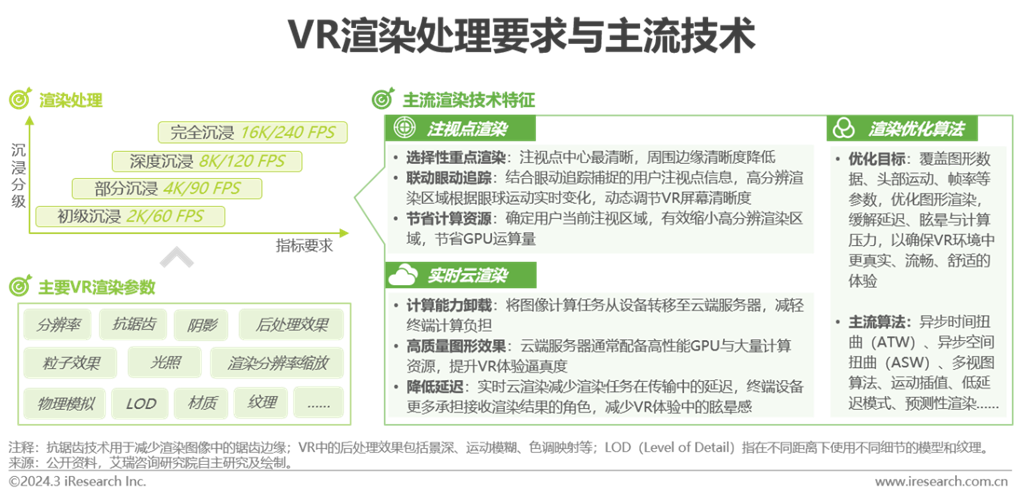 渲染處理主要涉及(1)內(nèi)容渲染:在VR環(huán)境中創(chuàng)建、生成各種元素、場景、對象與效果和(2)終端渲染:對生成的內(nèi)容進行畸變、色散等校正并呈現(xiàn)到用戶終端設備。為匹配用戶的進階需求,當前的VR渲染處理已跨越初級階段向部分沉浸階段邁進,在畫質(zhì)、速度、成本等多方面尋求質(zhì)量與效率間的平衡。相較于普通的3D渲染,VR渲染注重用戶體驗的全方位性,在幀率、延遲、交互控制、立體聲視圖、性能優(yōu)化等方面均有更高要求。作為連接用戶與虛擬環(huán)境的橋梁,渲染在VR中扮演重要角色,需要高規(guī)格硬件算力設備、成熟的XR可穿戴智能終端、優(yōu)化的渲染算法及逐步系統(tǒng)化的云渲染模式等技術的協(xié)同推動。當前階段,得益于眼動追蹤技術的成熟,注視點渲染吸引更多業(yè)內(nèi)玩家嘗試,如Quest Pro、PS VR 2、PICO 4 Pro等越來越多的VR設備已在產(chǎn)品中配置。AI算法的成熟應用,為渲染模型提供大量圖像、視頻數(shù)據(jù),VR場景質(zhì)量更為逼真。云化架構將渲染能力導入云端,云邊協(xié)同有助于降低終端配置成本,改善時延、抖動等問題。在硬件算力仍有不足的情況下,ATW、ASW等優(yōu)化算法也成為VR產(chǎn)品標配,以降低虛擬世界的渲染復雜性,進而緩解延遲與滯后。