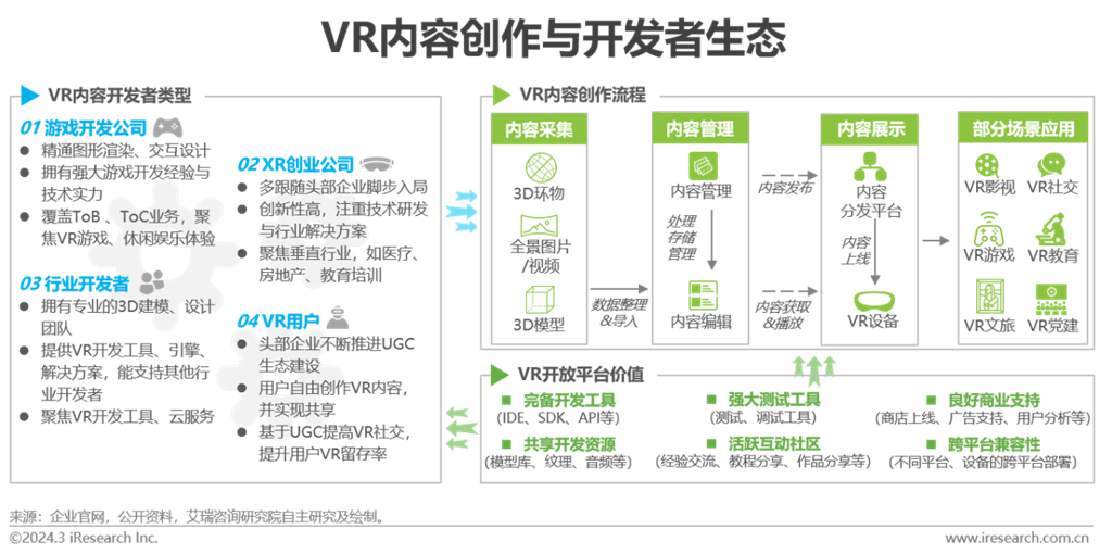 VR/AR內(nèi)容服務是虛擬現(xiàn)實產(chǎn)業(yè)鏈中較為復雜的一環(huán),由內(nèi)容制作與內(nèi)容分發(fā)兩部分構成。其中,內(nèi)容制作指創(chuàng)建用于虛擬現(xiàn)實環(huán)境的數(shù)字內(nèi)容,包括圖像、視頻、音頻、社交元素等,覆蓋游戲、影視、社交、直播、教育、房產(chǎn)家居、3D全景等多維度;內(nèi)容分發(fā)則是將制作好的VR內(nèi)容傳遞給最終用戶的過程,使用戶可在VR設備上訪問、體驗內(nèi)容。目前VR內(nèi)容的開發(fā)主體主要由VR游戲企業(yè)、XR企業(yè)和3D應用企業(yè)構成。在硬件終端不斷突破的基礎上,行業(yè)玩家將構建內(nèi)容生態(tài)作為戰(zhàn)略重點,紛紛推出VR開發(fā)者平臺或VR開放平臺;該種集成了開發(fā)環(huán)境和資源的平臺為VR創(chuàng)作者提供了全面的開發(fā)工具,方便開發(fā)者獲取、共享資源并可在不同VR設備上進行應用測試,進而確保各場景與設備上的穩(wěn)定性。創(chuàng)作門檻的降低,吸引了更多VR用戶參與內(nèi)容創(chuàng)作,用戶可通過社區(qū)互動分享作品、加強交流。互動性激發(fā)用戶創(chuàng)作熱情,疊加部分平臺的獎勵機制,促進優(yōu)質(zhì)內(nèi)容產(chǎn)出,用戶同時享受到更加豐富的虛擬體驗。