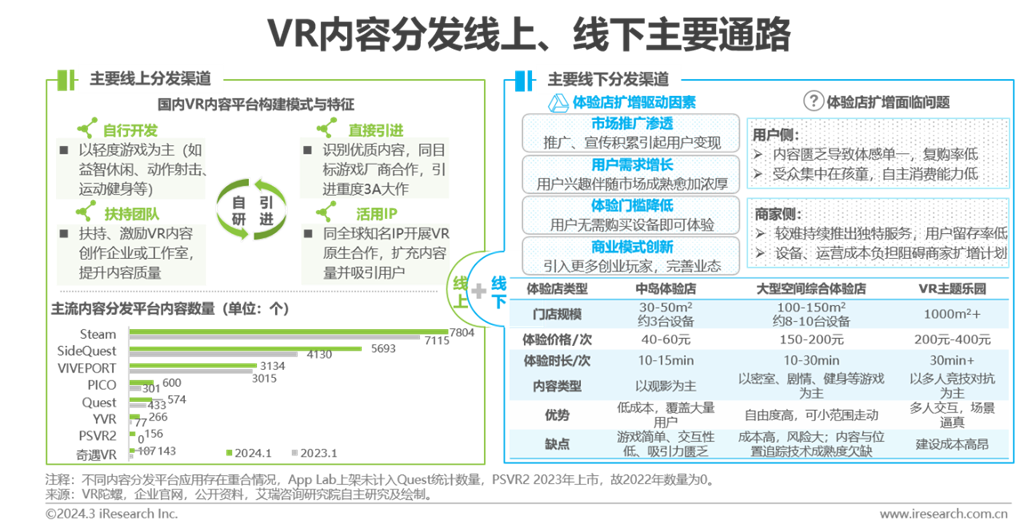 內(nèi)容分發(fā)平臺打破內(nèi)容碎片化,聚合的豐富內(nèi)容可匹配用戶不同興趣與需求。內(nèi)容分發(fā)渠道分為:(1)線上:由內(nèi)容分發(fā)平臺主導,為用戶提供在線購買、下載和體驗服務。目前線上分發(fā)渠道以各硬件廠商自行搭建為主,暫未出現(xiàn)第三方內(nèi)容分發(fā)平臺布局。從內(nèi)容數(shù)量角度,國外平臺占主導地位,其中Steam作為傳統(tǒng)游戲平臺,憑借多年積累優(yōu)勢,VR內(nèi)容數(shù)量一路領跑;國內(nèi)VR應用商店加速追趕,盡管內(nèi)容體量仍無法同海外頭部廠商抗衡,但通過自研與引進兩種模式,內(nèi)容量快速擴充。數(shù)量并非絕對標志,但多樣選擇為呈現(xiàn)優(yōu)質(zhì)內(nèi)容提供更大可能。(2)線下:多指B to C線下游藝門店,以VR體驗店為主。伴隨疫情開放,線下娛樂由停滯狀態(tài)開始不斷回溫,逐漸受到更多關注;如能有效緩解用戶與商家側面臨問題,VR體驗店有望成為VR產(chǎn)品出貨的重要支撐。