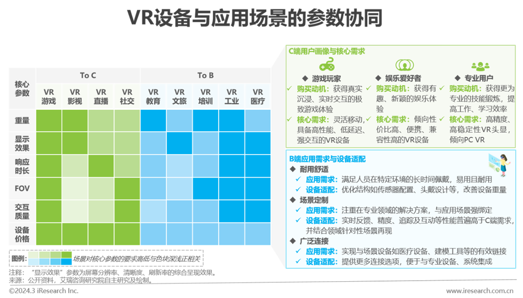 對于消費級領域,游戲是VR在C端落地最早且相對成熟的場景,VR游戲用戶的行業(yè)教育程度最深,導致其對VR產(chǎn)品及服務的敏感性增強。行業(yè)后續(xù)衍生的C端場景中,直播、社交等聚焦動態(tài)與實時交互的細分應用對響應時長、交互質(zhì)量更為關注。VR影視更多依賴預先開發(fā)內(nèi)容,應用重點在于展示。對于行業(yè)級領域,工業(yè)、醫(yī)療等技術門檻高的場景較為關注VR設備的可操作性,因而與應用效果直接關聯(lián)的各項參數(shù),均為該場景的關注重點。在教育、培訓等場景,VR技術與產(chǎn)品的應用價值多體現(xiàn)為對行業(yè)工作模式的創(chuàng)新改革,領域用戶對VR技術、服務性能容忍度更高。