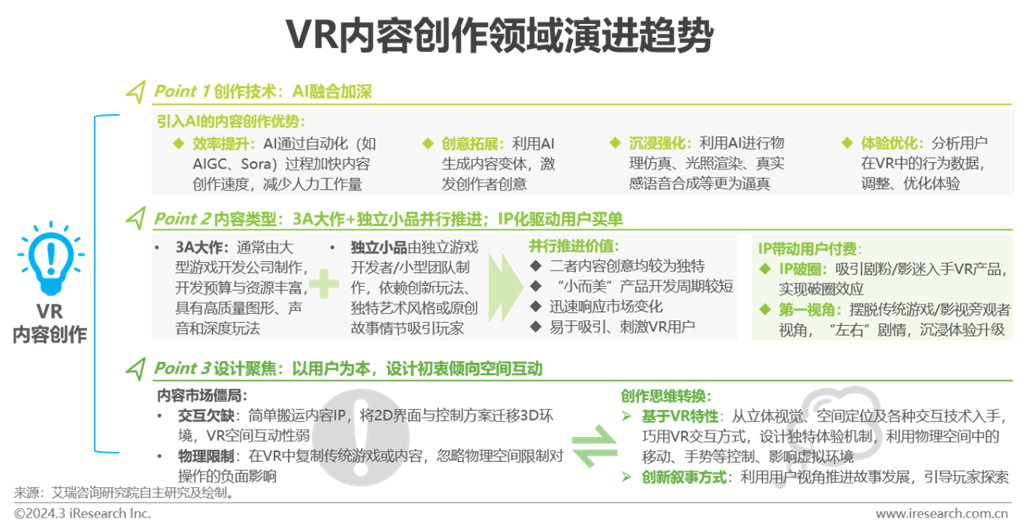 以AIGC為代表的自動生成式技術的出現(xiàn),不僅對于VR行業(yè),為整個數(shù)字內(nèi)容產(chǎn)業(yè)的創(chuàng)作突破帶來多樣可能性。AI技術的引入可以加快復雜虛擬環(huán)境的開發(fā)效率,同時提升動態(tài)生成角色行為、動畫的模擬程度,提高VR內(nèi)容演繹的真實性。將AI作為工具,不僅可以輔助創(chuàng)作者進行構思,兼顧優(yōu)化創(chuàng)作成本,一定程度緩解了現(xiàn)階段VR內(nèi)容開發(fā)成本高的困境。在內(nèi)容類型方面,大型制作和小型精品都將是未來VR內(nèi)容的布局重點。VR對于用戶的吸引更多在于其新穎與創(chuàng)新,因此開發(fā)者需要不斷擴充內(nèi)容數(shù)量并提高質(zhì)量來不斷刺激用戶,保持用戶對于VR的新鮮感。在目前VR代表作品較為匱乏的階段,化用IP資源引流將是短期更多玩家實踐的方向。過去的創(chuàng)作者受限于傳統(tǒng)游戲、影視注重畫面的開發(fā)思路而忽視了VR交互特性,未能充分的發(fā)揮VR特性讓用戶體驗到其特性。未來的創(chuàng)作將以VR特性為基點,強化用戶第一視角玩家的體驗。