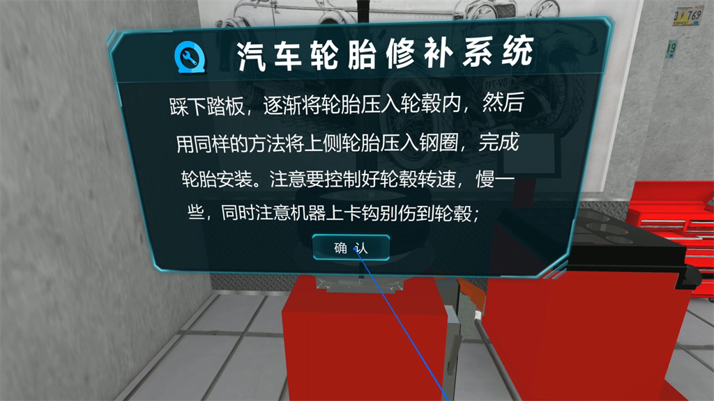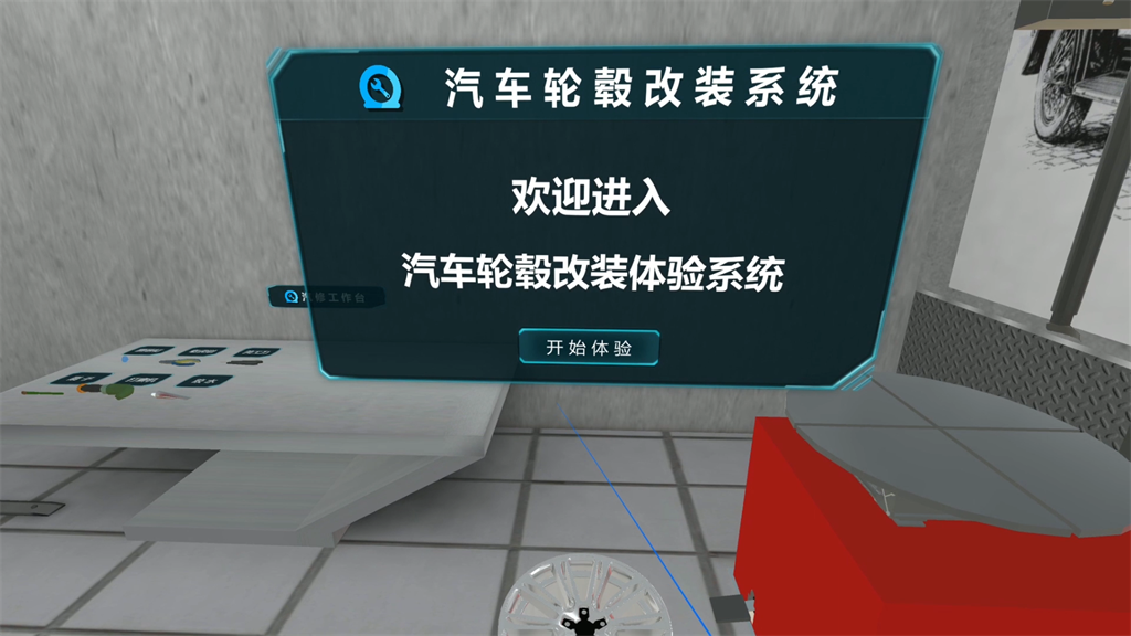 VR汽車輪毅改裝場景,還原汽車車間和換輪毅操作流程,服刑人員帶上VR眼睛,沉浸式學習換輪毅拆裝,換輪毅工具的識別和工具操作,讓服刑人員可以在虛擬場景中反復實踐,學習汽車輪胎修補技能。