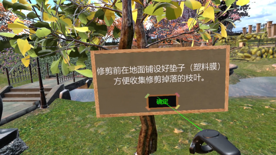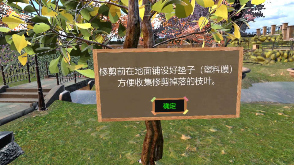 VR園藝工培訓場景,還原園藝修剪技能實操,虛擬仿真園林場景,體驗者學習使用修剪樹木,園林剪、電鋸等工具,并通過系統(tǒng)交互,按照語音指示使用電鋸對樹墻進行修剪,使用高枝鋸對果樹進行修剪等園藝修剪任務。