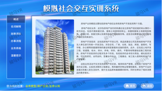 模擬社會交互實訓系統(tǒng)具備6種模擬業(yè)務辦理知識,涵蓋民政、房產(chǎn)、公證、工商、司法所及派出所等關(guān)鍵社會服務領(lǐng)域,每個模塊均細分為5個子部分,分別是繪聲繪影、業(yè)務認知、法律講堂、隨堂測驗、聯(lián)系直通車,旨在通過多角度、多層次的交互體驗,深化服刑人員對每一個業(yè)務流程的理解和掌握。